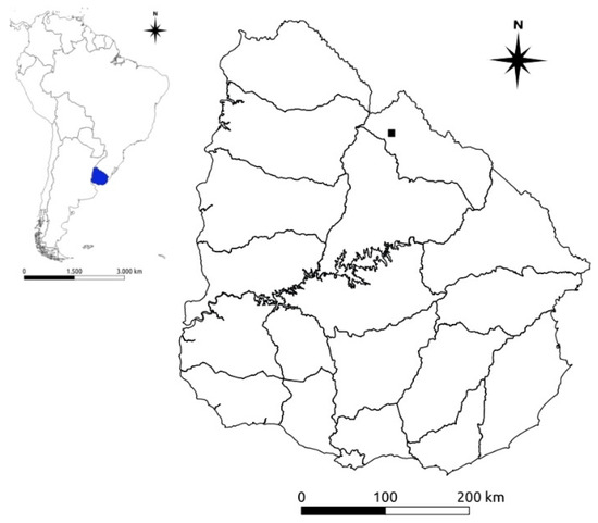 - Castaño, J.; Giménez, A.; Ceroni, M.; Furest, J.; Aunchayna, R. Caracterización Agroclimática del Uruguay 1980–2009; Serie Técnica N° 193; Unidad de Comunicación y Transferencia de Tecnología de INIA: Montevideo, Uruguay, 2010; p. 40. ISBN 978-9974-38-330-2. [Google Scholar]