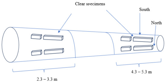 Current apparent density (Cd, g·cm−3), was assessed for age 21.8. From the same stems sampled for estimating Bdw, two logs of 1 m length located at 2.3 and 4.3 m height were extracted. Specimens from the intermediate position (50% in the radius) and from the north-south orientation were prepared of two dimensions: 25 × 25 × 100 mm and 25 × 25 × 400 mm (width, thickness, and length, respectively) (Figure 2). These samples were also used for bending and compression tests.