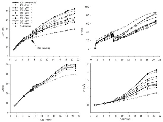 The growth curve of DBH and Ht shows a change in the behavior of both variables from the moment of second thinning onwards, from which the differences between thinning regimes increase (Figure 3). This response is more significant compared to the first thinning at 1.3 years. The differences at rotation age (20.8) are comparatively greater in the DBH than in Ht, with maximum and minimum values at lowest and highest densities, respectively. The final stand stockings of 200 and 300 trees·ha−1, whose initial densities were 400–550 and 550–700, respectively, show very similar growth at the end of the evaluation period. Vi follows DBH behavior due to its greater weight compared to Ht (Figure 3). For the individual variables, a relative stagnation in growth rates is observed after 18 years of age. DBH variation (CV) observed differs between thinning regimes. Densities with more than 300 trees·ha−1 showed more variation (between 70%–90% of the mean). Whereas regimes with less than these population showed less variation in DBH. However, the most severe thinning regime showed higher variation as well at the final age. The analysis of variance at the age of 20.8 years indicates significant differences for the three mentioned variables (Table 2). However, densities with differences of 50 trees·ha−1 showed small variation in individual growth considering final densities of 100 to 150 trees·ha−1. For those stockings the mean DBH is greater than 50 cm. On the other hand, the smallest DBH and Vi are recorded in the unthinned stand. At the same time, mean height remains similar in contrasting stockings such as 300 and 800 trees·ha−1.