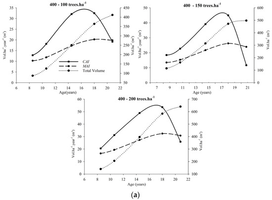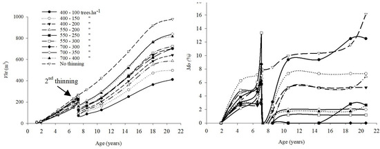 The evolution of the Vht shows that treatments with the largest tree densities doubles the volume of regimes with the smallest remaining tree densities. A notable decrease in the growth rate after 18 years of age is also observed for all the regimes (Figure 4). The Mo showed increasing levels until the second thinning but without any relationship with the stand stockings. The reduction in the number of trees that occurred in the second thinning determines a rapid drop in the loss of trees which subsequently recovers the levels prior to this moment. In all cases, relatively low values of Mo are observed except for populations with 400–100 trees·ha−1 and the control without thinning. The analysis of MAI-CAI curves indicates that the biologically optimal harvest age differs little between stockings and occurs around the age of 20 years (Figure 5a–c).