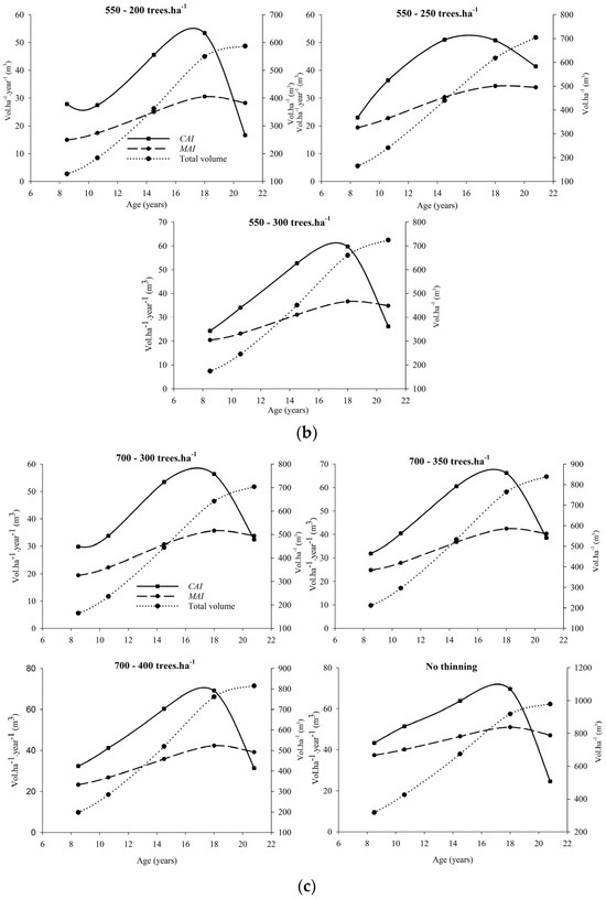 (a). MAI-CAI curves and Vht of thinning regimes of 400–100, 400–150, and 400–200 trees·ha−1 until 20.8 years. (b). MAI-CAI curves and Vht of thinning regimes of 550–200, 550–250, and 550–300 trees·ha−1 until 20.8 years. (c). MAI-CAI curves and Vht of thinning regimes 700–300, 700–350, 700–400 trees·ha−1 and No thinning until 20.8 years.