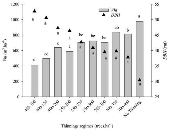 As expected, total volumes harvested in the second thinning were the larger in regimes with most significant reduction in the number of individuals, such as the regimes 400–100, 550–250/200, and 700–300 trees·ha−1. An inverse trend is recorded with the values obtained at harvest age and total wood harvested (Table 3). A joint plot of Vht and DBH is performed to understand the relationship between the total volume of wood, and trees fulfilling the requirement of large diameter for sawmilling industries. An inverse relationship between both variables was observed, with final densities of approximately 250 trees·ha−1, which would provide relatively high wood yields and diameter values (Figure 6).
