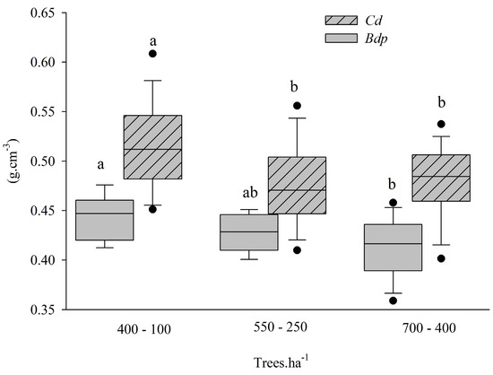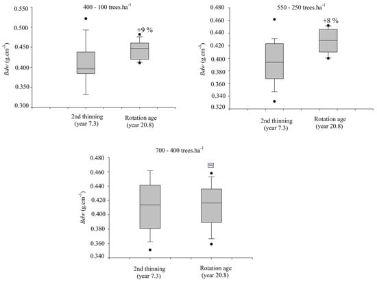 The analysis of the Bdw and Cd variance shows significant differences between final densities of 100, 250, and 400 trees·ha−1 (Figure 7). Combination of thinning 400–100 trees·ha−1, recorded larger Bdw and Cd. The greatest variability of the data is observed for this thinning, probably associated with the greatest number of specimens extracted from different positions in the logs.