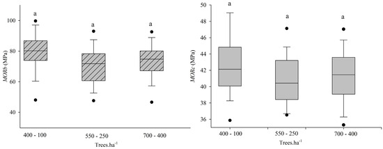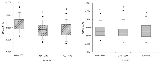 The analysis of variance did not detect differences in the bending and compression strength between different thinning regimes (Figure 9 and Figure 10). However, there is a tendency towards higher values, particularly with the MOEb and MOEc to the thinning combination 400–100 trees·ha−1.