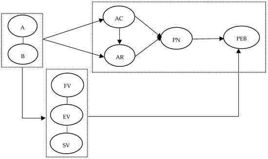 Conceptual model. Note: A = Host–guest interaction quantity; B = Host–guest interaction quality; AR = Ascription of responsibility; AC = awareness of consequences; PN = Personal norms; PEB = Tourists’ pro-environment behavior; FV = Functional value; EV = Emotional value; SV = Social value.