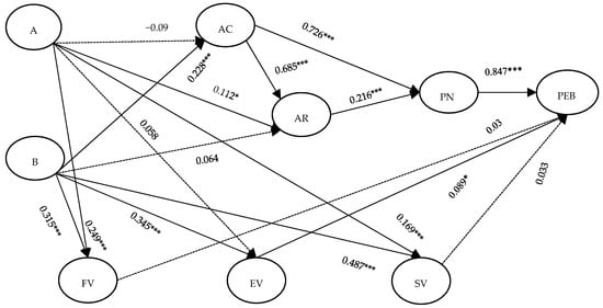 Structural equation modeling. Note: * p < 0.05, *** p < 0.001. A = Host–guest interaction quantity; B = Host–guest interaction quality; AR = Ascription of responsibility; AC = Awareness of consequences; PN = Personal norms; PEB = Tourists’ pro-environment behavior; FV = Functional value; EV = Emotional value; SV = Social value.