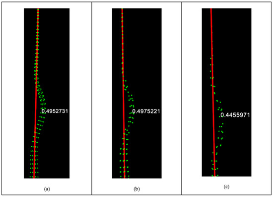 To identify defects within the detected tree stems, each stem was segmented into sections, with the central point of each section being determined. Figure 6 presents the synthetic point cloud with measurements of the stem curves. The dimensions of the original tree stem were first documented to evaluate the algorithms’ effectiveness and accuracy. This initial measurement confirmed the precision of the outcomes. Following this, the PCL was utilized to refine the tree stem’s point cloud using a VoxelGrid filter. This filtering process streamlined the point cloud by aggregating the points within each voxel around their centroid, resulting in a more concise and manageable representation of the tree stem. As illustrated in Figure 7, specifically, sample (b) was reduced to 124 points, and sample (c) to 74 points, compared to the original 392 points representing the entire tree stem (a).