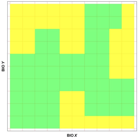 Figure 2. Hypothetical example illustrating the distinction between the Variable Non-Interaction Model (VNM) and the Variable Interaction Model (VIM). The spatial distribution of the focal tree species is depicted by green squares within the two-dimensional parameter space defined by two climatic characteristics, BIOX and BIOY. The VNM is constructed to encompass the entire two-dimensional region, represented as the Cartesian product of the intervals of BIOX and BIOY, inclusive of all green and yellow squares. In contrast, the VIM is exclusively trained on the subset of locations occupied by the green squares.