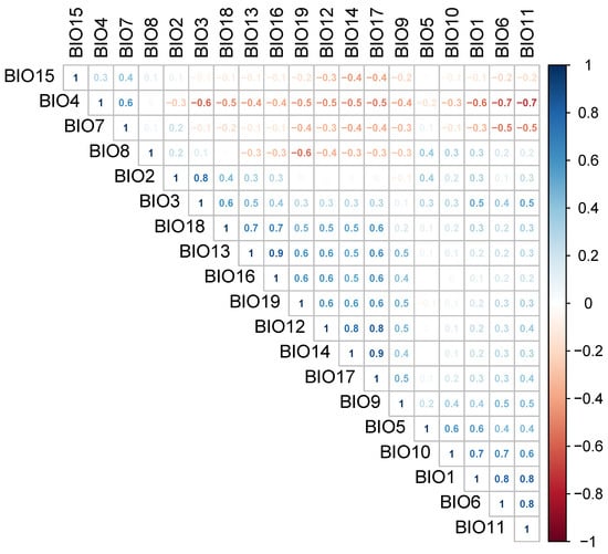 The second-largest cluster in Figure 1 comprises five temperature-related factors (BIO1, BIO5, BIO6, BIO10, and BIO11). These factors exhibit moderate-to-strong positive correlations with each other and display no significant correlation with the factors from the first cluster of precipitation-related factors. However, two temperature-related factors do not fall into this temperature-related cluster. One of them, BIO9 Mean Temperature of Driest Quarter, demonstrates small-to-moderate positive correlations with many precipitation-related factors of the first cluster and temperature-related factors of the second cluster. The second exceptional factor in temperature-related group, BIO8 Mean Temperature of Wettest Quarter, demonstrates a modest negative correlation with the precipitation-related factor BIO19 Precipitation of Coldest Quarter but exhibits no significant correlations with any other factors.