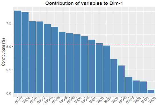 Figure 5. The contribution of the bioclimatic variables to the first principal component. The red dashed line illustrates the anticipated average contribution calculated under the assumption of equal contribution from all variables.