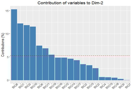 Figure 6. The contribution of the bioclimatic variables to the second principal component. The red dashed line illustrates the anticipated average contribution calculated under the assumption of equal contribution from all variables.