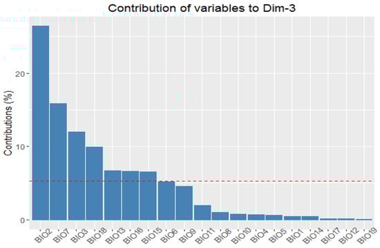 Figure 7. The contribution of the bioclimatic variables to the third principal component. The red dashed line illustrates the anticipated average contribution calculated under the assumption of equal contribution from all variables.