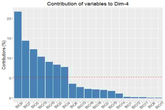 Figure 8. The contribution of the bioclimatic variables to the fourth principal component. The red dashed line illustrates the anticipated average contribution calculated under the assumption of equal contribution from all variables.