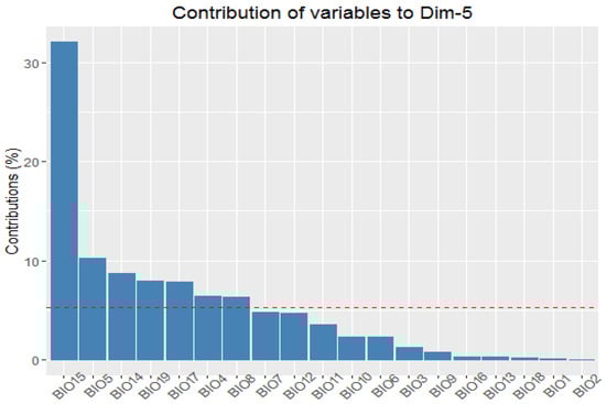 Figure 9. The contribution of the bioclimatic variables to the fifth principal component. The red dashed line illustrates the anticipated average contribution calculated under the assumption of equal contribution from all variables.