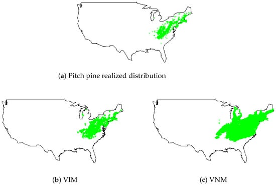 The VIM discerns forest plots characterized by climatic factor values identical to those observed in the realized distribution of pitch pine (Figure 2). Put differently, a plot is deemed part of the potential distribution of pitch pine if the vector v = ( v 1 , v 2 , , v 19 ) at that location corresponds to the combination of variables identified in the realized distribution: