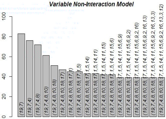 Figure 14. Predicted potential area for pitch pine (expressed as a percentage of FIA plots) utilizing the Variable Non-Interaction Model (VNM). Histogram columns depict simulations ranging from VNM2 to VNM19. The vectors in brackets display climatic variables (BIO1–BIO19) ordered by Shapley values (refer to Figure 12). Distribution maps for pitch pine in each VIM model are showcased in Figure 15 and Figure 16.
