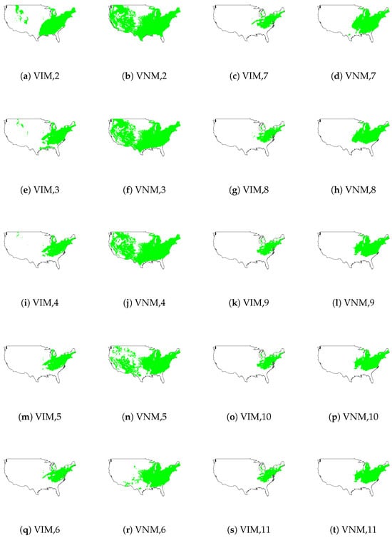 Figure 15. Potential distribution for pitch pine in the USA based on Variable Interaction Models (VIMs) and Variable Non-Interaction Models (VNMs) using sets of variables ranging from 2 to 11 (VIM2-11 and VNM2-11). Climatic variables (BIO1–BIO19) are arranged by Shapley values (Figure 11 and Figure 12). The areas of each potential distribution are provided in Figure 13 and Figure 14. Distribution maps for VIM12-19 and VNM12-19 are presented in Figure 16.