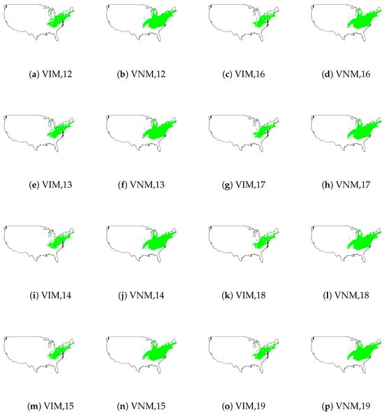 Figure 16. Potential distribution for pitch pine in the USA based on Variable Interaction Models (VIMs) and Variable Non-Interaction Models (VNMs) using sets of variables ranging from 12 to 19 (VIM12-19 and VNM12-19). Climatic variables (BIO1–BIO19) are arranged by Shapley values (Figure 11 and Figure 12). The areas of each potential distribution are provided in Figure 13 and Figure 14. Distribution maps for VIM2-11 and VNM2-11 are presented in Figure 15.