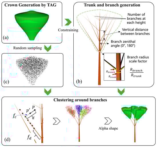 The modeling of individual trees in MART3D: (a) The generation of the crown by TAG; (b) Trunk and branch generation; (c) Leaf generation through random sampling within the crown; (d) Clustering of leaves around branches.