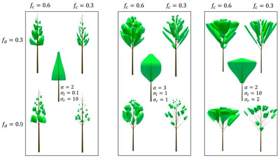 where is the new position of the leaf point ; and represent the unit vector and distance from to the nearest branch point, respectively. The value of ranges from 0 to 1, where indicates that all the leaf points are attached to the branch, and represents a completely random situation, where no leaf clumping occurs. As approaches the value of 0, more leaf points are clustered near the branch. The leaf distance factor to branch root, , indicates the distance of leaves from the root of the branch, i.e., determines the extent to which the leaves are concentrated at the top of the branches, mimicking natural plants where leaves are more densely distributed around the crown periphery. The range of is also from 0 to 1, controlling the starting points along branches when sampling the branch point cloud; when , the sampling begins from the branch root and leaves cover the entire branch, while means that only the branch tip is sampled. The closer its value is to 1, the more leaves are clustered at the branch tip. Several examples of generated individual trees with different crown shapes, and clumping factors, demonstrate that the TAG-based crown generation method can also produce cone- and ellipsoid-like shapes (Figure 3). Finally, the 3D contour envelope of the branch point cloud is created with the alpha shape algorithm (Figure 2d), which is widely used in 3D radiative transfer models for lightweight boundary descriptions of forest canopies [34].