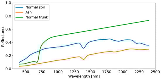 To demonstrate the usage of the proposed MART3D, we conducted a series of simulations over a burnt forest scene to characterize the burn severity through the remote sensing observed reflectance. The forest scene comprises five layers, including soil, grass, shrub, mediate tree and upper tree. The parameters used to construct the undisturbed forest scene (i.e., unburnt scene) are illustrated in Table 1. The spectra of normal soil, ash and trunk used in this study (Figure 5) were extracted from the Fire Research And Management Exchange System (Frames, https://www.frames.gov/, accessed on 1 November 2023). The disturbed scene is generated based on the undisturbed scene by defining the DL of each canopy layer and modifying the LAI and component spectrum, respectively, according to Section 2.3. The spectra of health and severe leaf are generated according to the green leaf and brown leaf parameters listed in Table 1 by using the PROSPECT model. The spectra of the burnt soil/branch are the composite of the normal soil/normal branch and ash spectra. To perform the simulation, the DLs of all the five layers are defined from 0 to 3 with a step of 0.5. However, some unrealistic combinations are filtered out according to the study of [7]; for instance, under the influence of wildfires, the DLs of the upper layer are generally not higher than the DLs of the lower layer. The simulations were carried out from 400 to 2500 nm with a 10 nm interval. Based on the simulated canopy reflectance, several vegetation indices and the corresponding CBI were computed and evaluated.