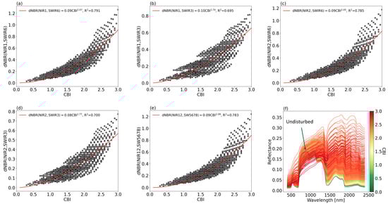 The scatter plot between CBI with different band combinations (a–e) and the simulated spectra under different CBI (f).