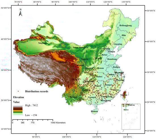 The original data presented in the study are openly available in National Specimen Information Infrastructure (http://www.nsii.org.cn/, accessed on 1 June 2022), National Plant Specimen Resource Center (https://www.cvh.ac.cn/index.php, accessed on 1 June 2022), Global Biodiversity Information Facility (https://www.gbif.org/, accessed on 3 June 2022), World Climate Data (http://www.worldclim.org/, accessed on 20 June 2022), Food and Agriculture Organization of the United Nations (https://www.fao.org/soils-portal/data-hub/soil-maps-and-databases/harmonized-world-soil-database-v12/en/, accessed on 20 June 2022), and Global Human Footprint of Socioeconomic Data and Applications Center (https://sedac.ciesin.columbia.edu/data/set/wildareas-v2-human-footprint-geographic, accessed on 1 July 2022).
