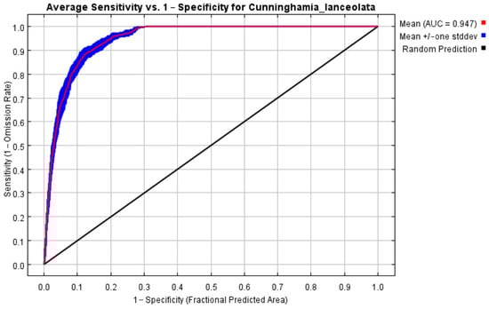 The AUC value of the area under the ROC curve was used to test the accuracy of the model. After 10 calculations, the mean test AUC was 0.947 (Figure 2), showing that the model could accurately predict suitable habitats.
