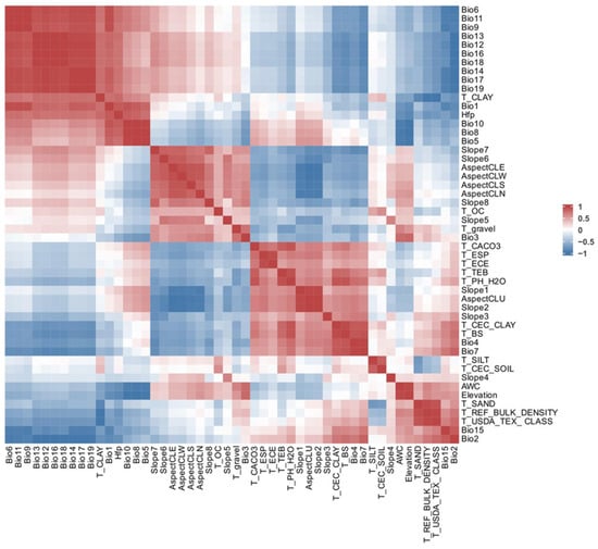 Terrain factor: elevation data were obtained from the Shuttle Radar Topography Mission (SRTM), which could be obtained from the world climate database (http://www.worldclim.org/, accessed on 20 June 2022). Global terrain slope and aspect data were obtained from the World Soil Database (https://www.fao.org/soils-portal/data-hub/soil-maps-and-databases/harmonized-world-soil-database-v12/en/, accessed on 20 June 2022).