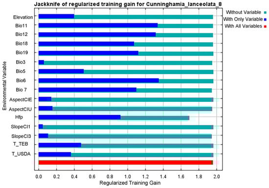 According to the contribution percentage in the first simulation and the correlation among factors (Figure 3), 16 environmental factors were selected, including 8 climatic factors, 5 topographic factors, 2 soil factors, and human activities (Hfp). Then, the 16 factors were simulated for the second time, and the leading environmental variable factors that limited the potential geographical distribution of C. lanceolata in China were selected based on the percent contribution, permutation importance, and knife-cutting test. The percent contribution was used to indicate the contribution degree of the variable to the model. The permutation importance indicated the dependence of the model on this variable. The knife-cutting method was used to analyze the relationship between different environmental factors and the distribution of suitable habitats for C. lanceolata. Criteria: The blue band represents “With only variable”, and the longer the band, the higher the score, indicating that this variable has a strong predictive ability for species distribution. The cyan band represents the training score of “Without variable”, that is, the sum of the contributions of the remaining variables except for this variable. If the score of “Without variable” is low, it means that this variable contains some unique information, which is also important for species distribution. The red stripe represents the cumulative contribution rate of all environmental variables to the established model.
