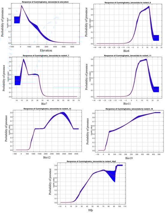 To further clarify the relationships between the distribution habitats of C. lanceolata and leading environmental factors, the response curves of the single environmental factor (Bio12, Hfp, Bio6, Bio11, Bio19, Bio7, and Elevation) were obtained based on the MaxEnt model (Figure 5). These curves show how the predicted probability of species distribution changed with each environmental variable.