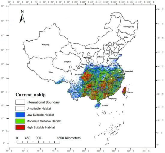Furthermore, the distribution area range did not change much, except in the expansion of Hainan Island. The distribution of suitable habitats without interference of human activities was upgraded to a low suitable habitat in the original unsuitable habitat, the low suitable habitat was upgraded to a moderate suitable habitat, and the moderate suitable habitat was upgraded to a high suitable habitat. In the area calculations without human activity factors, the total geographical distribution area of C. lanceolata was 218.65 × 104 km2, accounting for 22.78% of China’s land area and being 2.60% higher than the original suitable habitat area. The high suitable habitat accounted for 4.93%, the moderate suitable area accounted for 8.67%, and the low suitable area accounted for 9.18% of the total suitable habitat area. Without the impact of human activities, high suitable habitats were mainly distributed in eastern Sichuan, western Chongqing, Guizhou, Taiwan, Guangxi, southern Guangdong, Hunan, and Jiangxi. Moderate suitable habitat was widely distributed in the south of the Yangtze River, inlaid with the high suitable habitat. Generally, subtropical monsoon climate areas and tropical monsoon climate areas in the south of the Yangtze River were more suitable for the growth of C. lanceolata. The precipitation conditions were relatively abundant and the temperature conditions were relatively appropriate. Not considering the influence of human activities, these two kinds of areas were mainly high and moderate suitable habitats for C. lanceolata.