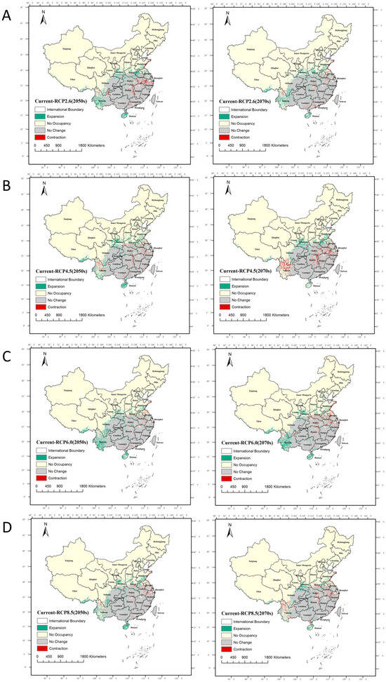 Change in the distribution of C. lanceolata habitats under different scenarios in the 2050s and 2070s. (A) RCP2.6, (B) RCP4.5, (C) RCP6.0, (D) RCP8.5.