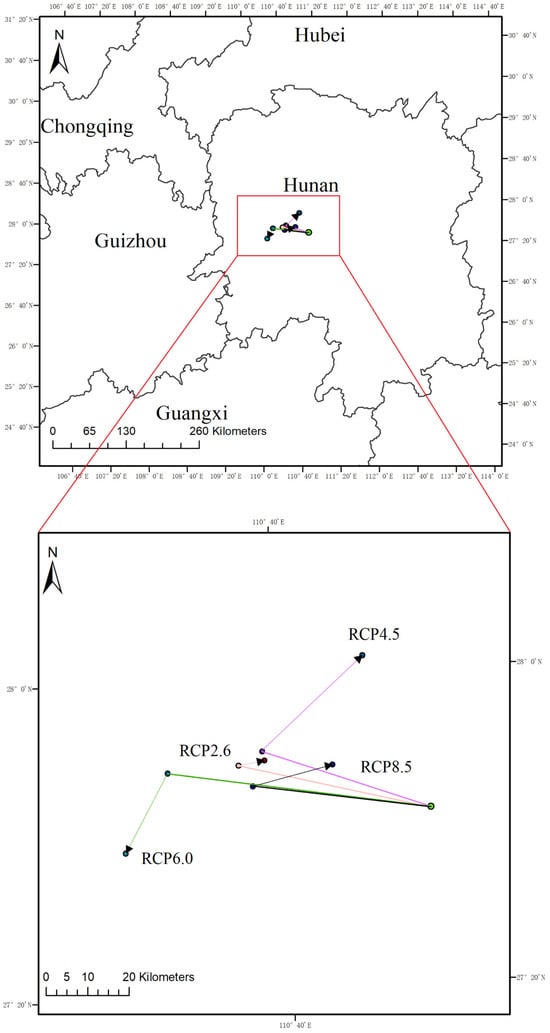 As mentioned above, the SDM toolbox (Tool of ArcGIS based on Python 2.7.14) was also used to treat the suitable habitats of C. lanceolata as a whole and to reduce them to a vector particle. Then, the changing trend of the suitable habitats and the distributional core position of suitable habitats in four scenarios in the present and future were calculated. The geometric core represents the overall spatial position of the suitable habitats of C. lanceolata, and the change reflects the overall spatial migration trend of suitable habitats [21].