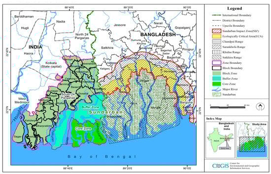 The Sundarbans mangrove forest is a hotspot for a wide range of ecosystem services (ES) [2]. According to the Millennium Ecosystem Assessment (MEA), ES represent the multiple benefits ecosystems provide to humans. The forest ES includes all the goods and services a forest ecosystem offers. Building on the ES classification framework of MEA (2005), the Common International Classification for Ecosystem Services (CICES) classified the ES into three categories: (i) Provisioning; (ii) Regulatiing and maintenance; (iii) Cultural [11]. Despite growing global attention to ES assessment and valuation [12], existing studies focused on the Sundarbans are patchy, and there is a research gap in the systematic assessment of ES provided by this mangrove forest. Therefore, their economic value remains largely unknown and underestimated [13]. The Sundarbans act as a natural safeguard for coastal communities against storms, cyclones, and coastal soil erosion. They deliver many materials and resources that support daily life for local communities and households [14,15]. In addition to this, they provide a habitat for wild fauna and flora, which is important for maintaining coastal biodiversity and ecological integrity [16]. This includes hosting many threatened and endangered species such as the Royal Bengal tiger, estuarine crocodile, Indian python, and some species of river dolphins [8]. Consequently, the Sundarbans is considered a haven for biodiversity conservation and, at the same time, an important hub for the provision of ES [17]. About 3.5 million Bangladeshi and 4 million Indian people are directly or indirectly dependent on these ES for their livelihood and socio-economic wellbeing [8,18,19,20]. However, the Sundarbans are decreasing quickly, with an annual rate of 1.2% [20], which is higher than the global rate of 0.15% [2], due to anthropogenic and climate change reasons [21,22,23]. Das and Datta [24] reported that anthropogenic activities are one of the major causes for ecological degradation of the Sundarbans. For instance, given the increasing population density in the Sundarbans Biosphere Reserve (SBR) (The SBR in West Bengal, India, is part of the largest mangrove forest ecosystem in the world. It covers an area of 9630 km2 and is divided into the core, buffer, and transition zones (Figure 1). The core zone does not allow any anthropogenic activities (except research) to conserve the major habitats of flora and fauna of the Sundarbans. The core and buffer zone covers 4263 km2, and the 2585 km2 Sundarbans Tiger Reserve (STR) is located inside the core zone. The buffer zone is used for fishing and collecting honey with permits. The transition zone covers an area of 5367 km2, a densely settled area used for agricultural practices [25]) and the decreasing one within the Sundarbans Impact Zone (SIZ) (The SIZ is an area within a 20 km wide radius surrounding the periphery of the Bangladesh Sundarbans. About 1750 km2 area (10 km wide from the forest boundary) inside the SIZ was declared as an Ecologically Critical Area (ECA) to protect biodiversity from anthropogenic impact (Figure 1). The SIZ also comprises five districts (Bagerhat, Khulna, Satkhira, Pirojpur, and Barguna), and the population residing within this area are directly dependent on the Sundarbans for their livelihood [26]). The number of people depending on the Sundarbans ES is increasing, which may lead to a growing demand for resources [7], a growing risk of over exploitation [13], and ultimately the integrity of mangrove forest ecosystems [27].