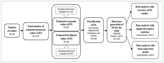 In our meta-regression model, we investigated the single and joint effects of explanatory variables using three different models (Model 1, Model 2, and Model 3), considering the effects of single variables, all variables, and two variables, respectively. In the case of two variables, we considered the following: (i) ES types and (ii) valuation methods to find out the effect on estimated economic values, and (i) GDP and (ii) population density for livelihood values. By running three separate models, we aimed to gain a more in-depth understanding of the variables influencing the economic value of ES [47]. The Equations (7) and (8) describe the two models with reference to the economic and livelihood value of ES, respectively: