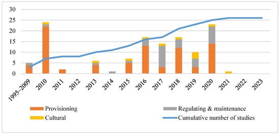 A total of 145 estimated ES values were identified and analyzed to estimate the monetary values of ES provided by the Sundarbans. Of these, 127 were selected from 26 publications, and the remaining 18 were derived through an expert-based estimation. The number of studies and publications on ES from the Sundarbans increased gradually from 1995 to 2023, and no studies were found for the years 2012, 2022, and 2023 (Figure 3). According to our review, the first study on the economic valuation of the Bangladesh Sundarbans was published in 1995, while the first study for the Indian Sundarbans was published in 2009 (Appendix B). Early publications were mainly focused on the estimation and assessment of provisioning ES, while the attention paid to regulating and maintenance, as well as to cultural ES, is more recent (Figure 3).