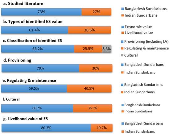 The literature review also revealed that most of the studies identified refer to the Bangladesh Sundarbans (73%), with a lower proportion (27%) referring to the Indian Sundarbans. The estimation of economic values (61.4%) prevails on those for livelihood values (38.6%) of ES. We found that most of the estimated ES values regard provisioning ES (66.2%), followed by regulating and maintenance (25.5%) and cultural (8.3%) ES. According to the review, studies targeting the Bangladesh Sundarbans prevail over those scoping the Indian Sundarbans (73% vs. 27%) (Figure 4).