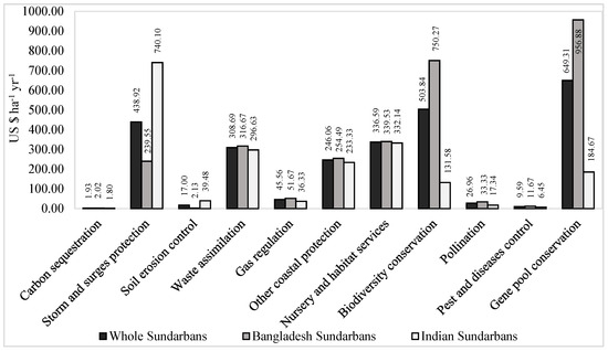 The estimated regulating and maintenance of ES for the Sundarbans include protection against storms and surges, biodiversity conservation, gene pool conservation, nursery and habitat services, waste assimilation, gas regulating, soil erosion control, pollination, pest and disease control, carbon sequestration, and other coastal protection ES (Table 2). The highest and lowest economic values for the whole Sundarbans were found for gene pool conservation (US $ 649.31 ha−1 yr−1) and carbon sequestration (US $ 1.93 ha−1 yr−1), respectively (Figure 5). Except for storm and surges protection and soil erosion control, the values of all other ES were higher for the Bangladesh Sundarbans than for the Indian ones. The largest value gaps between the two countries were found for biodiversity and gene pool conservation, which show values about five times higher for the Bangladesh Sundarbans than for the Indian ones. However, the values for storm and surges protection were three times higher for the Indian Sundarbans (Figure 5).