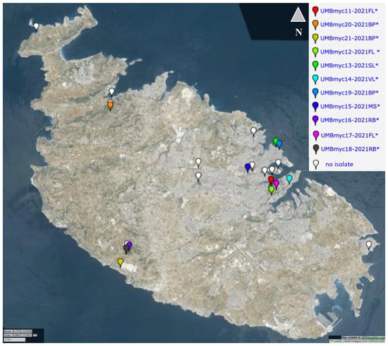 We conducted several walk-through surveys to observe the presence of WDF in different locations of the Maltese Islands during the rainy season from September 2020 to March 2023. The sampling locations were specifically selected for the presence of medium to large-size indigenous and exotic phanerophytes in semi-natural woodland and public gardens. All the sampling locations were geotagged with an IPhone 13 Pro smartphone and host plant species noted and identified against the available literature [33]. Any basidiomes spotted on the host species were carefully collected with a sharp knife and placed in a paper bag and processed for axenic isolation within 1 h from collection. A portion of the context, which is the mycelium layer between the hymenium and the pileus, was removed for axenic culture isolation, with the remaining part of each basidiome placed in a paper bag, given an accession number and dried at 50 °C in a drying cabinet to produce an exsiccate collection.