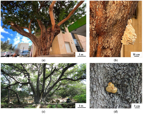 WDF on monumental trees. Laetiporus sulphureus on Ceratonia siliqua growing at University Campus, Msida (a,b); Inonotus rickii (anamorph: Ptychogaster cubensis Pat.) on Quercus ilex growing at Buskett, Rabat (c,d).