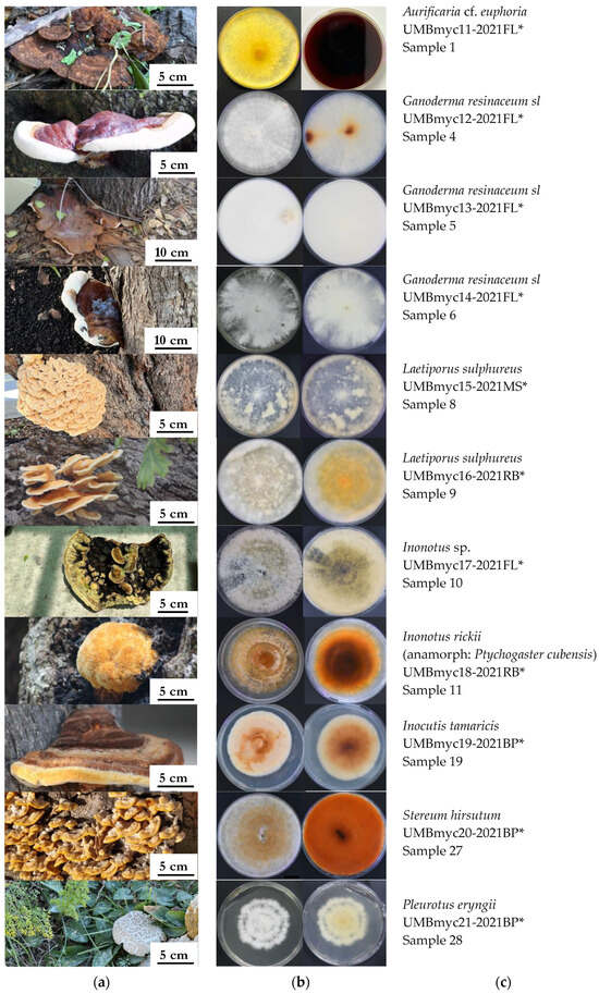 Wood decay fungi isolated in Malta. (a) Basidiomes; (b) isolates’ growth on PDA top and bottom sides; (c) species name, accession number and isolate number.