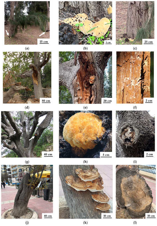 The WDF identified in our study can be further categorized into two types: white-rot and brown-rot [13]. The white-rot fungi causing heartwood rot are Aurificaria cf. euphoriae, Inonotus rickii, Inonotus sp., Inocutis tamaricis and Pleurotus eryngii, whereas Stereum hirsutum causes sapwood rot and, Ganoderma resinaceum causes butt and root rot [66]. The sole brown-rot species which causes heartwood rot is Laetiporus sulphureus [66]. As shown in Figure 1, the sampled trees are growing in highly urbanized areas, were usually their fitness is not at the very best, and can be further decreased by the WDF, therefore making the infected trees more sensitive to windthrow, and harming the surrounding environment.