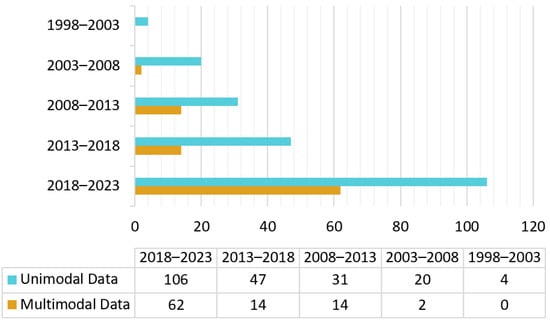 Number of papers per five-year interval for various modal data. (a) Number of the unimodal data studies. (b) Number of the multimodal data studies.