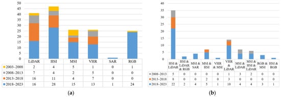 Focusing on multimodal remote sensing data in Figure 2b, regardless of the time frame, the most used multimodal data were HIS and LiDAR; in the 2 January 2018 and 1 January 2023 time span, the main multimodal data used for tree species classification were HIS and LiDAR (total 26 cases), VHR and LiDAR (total 10 cases), and MSI and HSI (total 6 cases). In the 2 January 2013 and 1 January 2018 time span, the main multimodal data were HIS and LiDAR (total nine cases). In the 2 January 2008 and 1 January 2013 time span, the main multimodal data were HIS and LiDAR (total five cases).