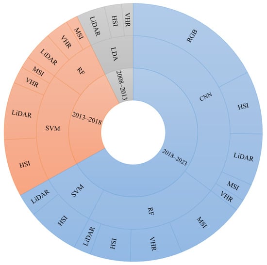 Focusing on unimodal remote sensing data in Figure 2a, the most used unimodal data are HIS. In the 2 January 2018 and 1 January 2023 time span, the main unimodal data used for tree species classification were HIS (total of 28 cases), and RGB (24 cases). Since 2018, deep learning algorithms have dominated digital image processing. These algorithms rely on RGB images as input data, and the proliferation of drones has made it easier to obtain small-scale RGB images of tree species. Consequently, a vast amount of tree species classification literature on CNN and RGB has emerged within this timeframe. In the 2 January 2013 and 1 January 2018 time span, the main unimodal data were LiDAR (total of 16 cases) and HSI (total of 11 cases). In the 2 January 2008 and 1 January 2013 time span, the main unimodal data were LiDAR (seven cases), HIS (four cases), and VHR (five cases). In the 2 January 2003 and 1 January 2008 time span, the main unimodal data were HSI (four cases) and MSI (five cases). So, the main unimodal data for tree species classification were HSI, LiDAR, RGB, and VHR.