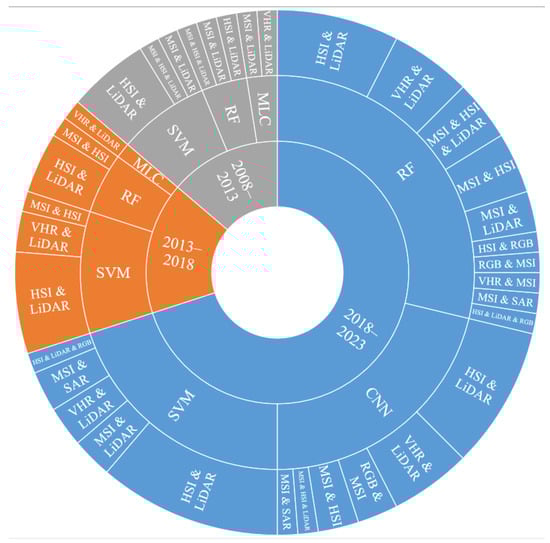Focusing on unimodal remote sensing data and their most efficient classifier in Figure 3, in the 2 January 2018 and 1 January 2023 time span, the main classifiers were CNN, SVM, and RF. In the 2 January 2013 and 1 January 2018 time span, the main classifiers were RF and SVM, In the 2 January 2008 and 1 January 2013 time span, the main classifier used for optimal classification results was LDA. With the development of remote sensing and computer science and technology, the main classification methods of unimodal remote sensing were CNN, RF, and SVM.