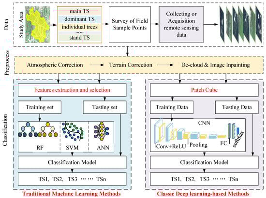 The classification process for tree species using traditional machine learning methods involves preprocessing, extracting and selecting features, classifying the species using classifiers, and evaluating the results. The process of classic deep learning-based methods involves preprocessing, and cutting the remote sensing image data with labels into a patch cube, dividing the patch cube into a training set and a test set, using the data from the training set to train the CNN, storing the parameters of the best classified CNN model, and finally testing the network with the data from the test set to obtain the final TS classification result. The main difference between these two methods is whether or not the feature extraction is automated.