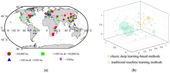 In Figure 6a, the study areas are categorized by size. Red dots represent areas larger than 10,000 hectares, green rectangles represent areas between 1000 and 10,000 hectares, blue triangles represent areas between 100 and 1000 hectares, and magenta hexagrams represent areas smaller than 100 hectares. In Figure 6b, the size of study areas for traditional machine learning methods is represented by green bubbles and classic deep learning-based methods are represented by orange bubbles. Meanwhile, a larger bubble indicates a larger study area.