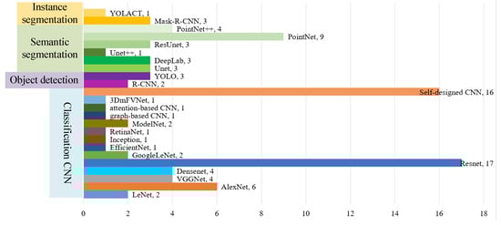 The statistical analysis results of the 71 papers categorized by the function of CNNs are presented in Figure 8.